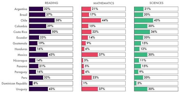The chart below is an example of how DR scores in terms of academic achievement against other countries in South America (source UNESCO), demonstrating just how bad things are. It shows the % of year 6 students achieving a satisfactory level and above in the three key subject areas.