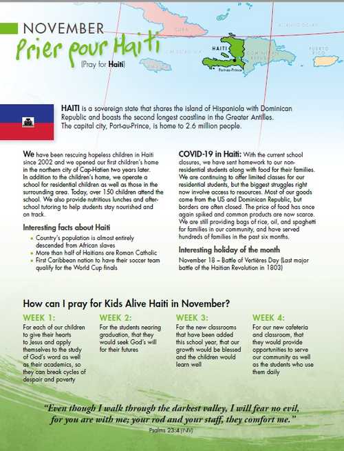 Each month we ask our supporters to pray for us and this month we are focusing on Haiti. Click here to download a summary sheet of the prayer requests from our school and residential centre in Cap-Hatien, serving over 150 of some of the city’s most vulnerable children. This includes a 4 week prayer diary as well as some useful background information about Haiti and our projects there.