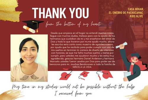 “I was sad, full of doubts, and lacked understanding when I arrived at Juniper Tree Children’s Home. The staff took care of me, helped me, and taught me God’s love. I am now writing this letter to express my gratitude for helping me fulfill one of my dreams: an interior design degree with honours. I still have many dreams and goals I want to achieve, but you helped me so much and I am grateful. Thank you, Dan Anderson and Maricela (Kids Alive Peru staff). God used you to bless me. I wish many blessings upon the whole Kids Alive Family.”